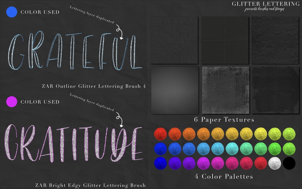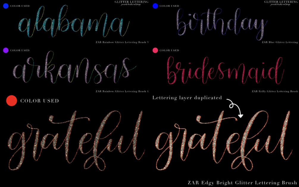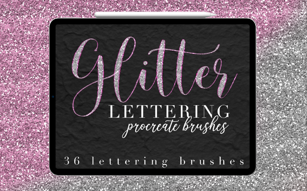 Create beautiful glitter lettering digitally, without the expense and mess! You’ll find 36 different glitter lettering brushes. The glitter textures, shadows, 3D effects, highlights, rainbow effect and outlines are all built in to the brushes!
