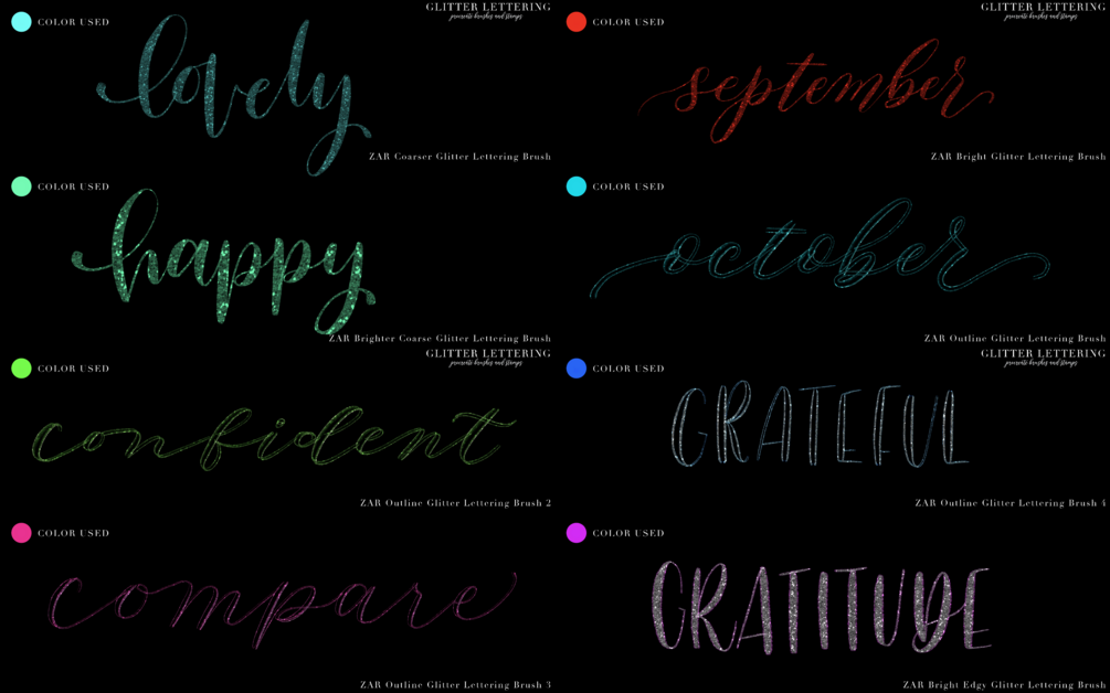 - 36 Glitter Brush Lettering Pressure Sensitive Procreate brushes including brushes with built in features such as color changing, shadows, 3D effect, outlines, ribbon, highlights, and regular.
