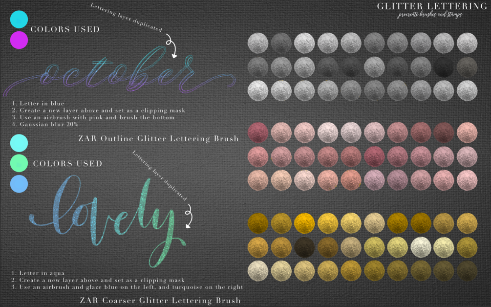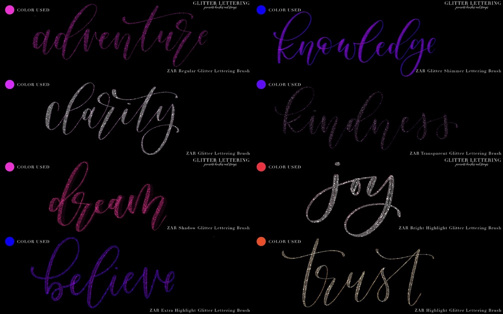 Create beautiful glitter lettering digitally, without the expense and mess! You’ll find 36 different glitter lettering brushes. The glitter textures, shadows, 3D effects, highlights, rainbow effect and outlines are all built in to the brushes!